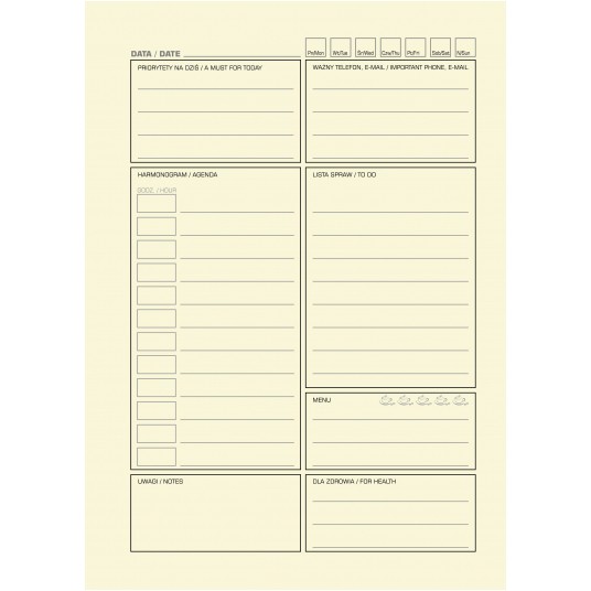 - na lewej stronie miejsce na notatki, harmonogram dnia, ważny telefon/e-mail, priorytety, menu, dla zdrowia i uwagi
